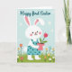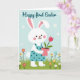 This card features a white bunny standing in a bright green meadow, holding a small clay-colored flower pot as if offering it to someone special 🐰. The bunny has long ears with pink inner details, rosy cheeks, and a gentle smile that suggests a sweet, friendly affection. It wears teal overalls dotted with darker spots, adding a cozy, storybook look to the scene. A vivid pink tulip rises from the pot with a slender green stem and leaves, like a small spring gift 🌷. Across the top, the words “Happy first Easter” appear in a thin, flowing dark line, centered against the sky for easy reading. Behind the bunny, a light blue sky is sprinkled with small white, daisy-like flowers that float like confetti. Along the bottom edge, simple red, yellow, and light blue blossoms peek out from the grass in a neat band of color.