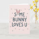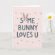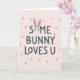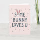 This card features the phrase “SOME BUNNY LOVES U” centered in soft, rounded charcoal-grey lettering, giving the message a gentle, friendly look 🐰. In the word “SOME,” the “O” is replaced by a simple long-eared bunny face in white, with rosy inner ears, tiny black eyes, and a small pink nose and mouth that feels like a quiet, affectionate smile. The bunny’s calm expression and the cozy wording together suggest a sweet bond, like a note meant for someone you keep close. Behind the text, a muted blush-pink background sets a calm, romantic tone without being flashy. Small four-pointed grey stars are sprinkled across the backdrop, adding a light, dreamy touch 🌷. The message sits prominently in the middle with generous space around it, so the bunny face reads clearly as part of the lettering. The palette stays mostly to blush pink, charcoal grey, and white, with tiny pink accents in the ears and face, while the grey stars repeat evenly across the background.