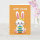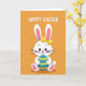 This card features a cartoon-style white rabbit with soft pink inner ears and rosy cheeks, looking straight ahead with wide black eyes that feel friendly and a little bashful 🐰. A bright yellow bow sits on top of its head, adding a sweet, dressed-up touch. The rabbit sits upright and hugs a decorated oval egg close to its chest, as if it’s holding a small gift for someone special. The egg has a teal base with sunny yellow horizontal bands dotted with lighter circles, plus scattered pink stars for extra sparkle. Behind the rabbit, a warm tangerine-orange background fills the whole space and makes the pale fur and teal egg stand out. Near the top, rounded white text is centered above the rabbit as a festive greeting, easy to read against the orange. Small details like a tiny red nose, fine whiskers, pink paw pads, and a fluffy tail are clearly drawn, with a little 🌷 tucked into the starry egg pattern.