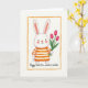This card features a sweet white bunny with long ears tinted pink inside, rosy cheeks, and a tiny heart-shaped nose, gazing forward with a gentle, friendly look 🐰. The bunny wears an orange-and-white striped tunic, adding a cozy, affectionate touch to its simple watercolor style. Cradled in its paws is a small bouquet of three bright pink flower buds with green stems and leaves, as if it’s offering them to someone special 🌷. The background stays white and airy, keeping the focus on the bunny and its little gift. A warm, earthy orange border with an uneven, hand-drawn look frames the scene on all sides. Below the illustration, a seasonal greeting is placed near the bottom in a flowing, cursive-style font, colored in a soft gray. The paint texture looks light and slightly translucent, with gentle pooling around the edges of the ears and clothing. The border line appears slightly wavy, with the orange stroke thickening at a few corners.