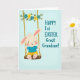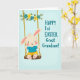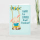 Designed with a sweet spring scene, this card features a bunny-like character with a creamy pale face, rosy cheeks, pink inner ears, and wide gentle eyes that seem to gaze out with friendly affection 🐰. The character sits on a rustic wooden swing, dressed in a teal top and sunny yellow shorts that brighten the center of the design. Golden-brown ropes rise from the swing to a floral arch, where yellow and teal blossoms mix with fresh green leaves like a soft garden frame 🌷. The pastel blue background has a faint diagonal crosshatch texture that adds depth while keeping the focus on the little rider. To the right of the illustration, rounded lettering reads “Happy 1st EASTER. Great Grandson!” in a dark, easy-to-read color, stacked neatly to balance the scene. Small details, like the pink pads on the character’s feet and the gentle curve of its pose, add a tender, caring tone without needing extra words. Above, the arch’s leaves and blossoms form a loose half-circle, with tiny yellow flowers tucked between teal petals and greenery.