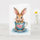 This card shows a long-eared bunny peeking up from an ornate teacup on a white background, as if it’s been caught in a sweet little moment 🐰. The bunny has wide dark eyes, rosy cheeks, and fine whiskers that give it a tender, friendly look, like it’s leaning in to greet someone special. Its fur blends warm browns with creamy white patches, with soft shading that makes it look extra cuddly. The teacup is sky blue and covered in pink rose blossoms with green leaves, adding a gentle, romantic garden feel 🌷. A thin gold edge traces the rim and handle, giving the cup a classic, polished touch. The bunny’s tiny paws rest on the cup’s lip, suggesting a shy, affectionate curiosity toward the viewer. Near the top, a short greeting appears in small, light-colored lettering, leaving plenty of open space around the illustration. Beneath the saucer, a faint blue watercolor wash spreads outward in a soft puddle shape.