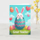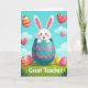 This design shows a cheerful white bunny with big, shining eyes and rosy cheeks, leaning forward as it peeks out of a large teal egg, as if greeting someone special with a tender, friendly gaze 🐰. The egg is decorated with pink wavy lines, and the bunny’s ears are edged in soft pink while little paws rest on the cracked shell. Behind it, an airy blue sky stretches across the top with puffy light-blue clouds that keep the scene light and dreamy. Around the bunny float smaller decorated eggs in coral stripes, sunny yellow patterns, and pink polka dots, like little gifts drifting nearby. Scattered red and rose hearts hover among the eggs, adding a gentle romantic touch, like a quiet “I’m thinking of you” carried through the air 🌷. Along the bottom edge, a simple line of white text is centered and stands out clearly against the green ground. The landscape beneath is a smooth, stylized green field with minimal plant shapes and rounded details near the horizon.