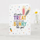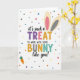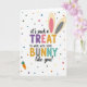 This card features a bright, friendly layout that feels like a warm note between close coworkers or friends 🌷. In the center, a mixed-style line of text reads, “it’s such a TREAT TO WORK WITH SOME BUNNY like you!”, with the smaller words in darker tones and the key words given extra attention. “TREAT” and “BUNNY” are set in large, chunky letters, each one a different pastel shade such as deep purple, soft pink, sunny yellow, and teal, giving the phrase a teasing, affectionate emphasis 🐰. Above the wording, two tall bunny ears rise up, one with a soft pink inner section and the other in muted gray, like a pair leaning in together. Near the lower left, a simple orange carrot with leafy green tops adds a little wink of shared humor. The background stays white to keep everything airy, while scattered polka dots in both bright and muted colors spread across the space like confetti. The main phrase sits centered, with the standout words in multicolored letters and the remaining text in smaller, darker lettering around them. Small round dots in assorted colors are sprinkled across the white background, with the carrot anchored at the lower left and the ears hovering above the central text.