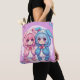 Cute pair of chibi bunny twins dressed in pastel pink and blue fluffy hooded rabbit costumes.