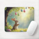 A curious bunny sits under a tree adorned with colorful, hanging Easter eggs, enjoying the serene morning light