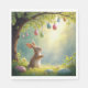 A curious bunny sits under a tree adorned with colorful, hanging Easter eggs, enjoying the serene morning light.
