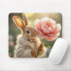 A charming rabbit in a fluffy fur coat with a bowtie holds a large, pastel pink peony flower with a soft, dreamy background