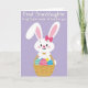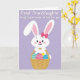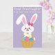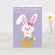 This greeting card shows a friendly, human-like bunny centered on a soft lavender background, with a gentle, affectionate look that feels like it’s meant for a close friend. Its fur is bright white, the long ears are lined with light pink, and its cheeks are rosy with a small deep-pink nose, topped off with a pink bow on one ear 🐰. The bunny holds a golden-brown woven basket close to its chest, as if offering it with quiet care. Inside the basket sit decorated eggs in teal, bright pink, and sky blue, with a peek of sunny yellow that adds a cheerful accent 🌷. The overall colors stay in the pastel range, keeping the scene calm while still lively through the egg patterns. Near the top, a short greeting appears in white lettering, centered above the bunny and easy to spot against the lavender. Fine shading around the ears, cheeks, and basket weave adds depth, and the eggs show neat stripes and small decorative marks. The basket rests in the bunny’s front paws, with the patterned eggs clustered tightly together just below the white text.