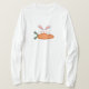 A cute white bunny with a big orange carrot on customizable Easter design Tshirts and other apparel.