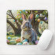 A fluffy rabbit sits in a vibrant meadow surrounded by colorful, decorated Easter eggs