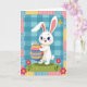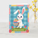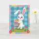 This card features a white bunny 🐰 with sparkling blue eyes, rosy cheeks, and an open-mouthed smile, standing upright like a friendly little character. It hugs a large oval egg close to its chest, as if holding a gift for someone special, with a tender, affectionate posture. The egg is decorated with horizontal stripes in blues, purples, pinks, oranges, and yellows, creating a cheerful rainbow effect. Behind the bunny, a light blue background is filled with a gingham-style check pattern that feels cozy and calm. A quilt-like border frames the scene with small patterned squares in soft pastel blues, pinks, and yellows, keeping the edges lively without feeling busy. Near the bunny’s ear, a small yellow winged insect hovers, like it has drifted in to share the moment 🐇. Two bright fuchsia flowers with sunny yellow centers sit in the foreground on a gentle green hill, their petals sharply defined against the grass.