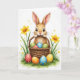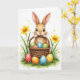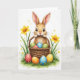 Designed with a sweet spring illustration, this card features a round, fluffy rabbit with soft brown fur and large, expressive eyes looking straight ahead with a tender, welcoming gaze 🐰. The rabbit holds a rustic woven basket close to its chest, as if offering it to someone special in a quiet gesture of friendship. Inside the basket sit decorated eggs in reds, yellows, blues, and greens, each dotted with small polka patterns that add a light, festive touch. Slender green blades of grass rise around the rabbit, with golden-yellow flowers similar to daffodils leaning in like they’re part of the moment 🌷. A soft green wash near the bottom grounds the scene, while the white background keeps everything airy and focused on the characters and details. The greeting text is placed near the top in a gentle pastel tone that stands out clearly against the white space. The basket’s woven texture is shown with fine lines, and the eggs are clustered tightly together with tiny dots and stripes visible on their shells.