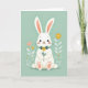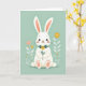 This design shows a white bunny sitting upright and centered against a muted teal background, framed by airy spring plants that lean in like quiet companions 🐰. Soft, even lighting smooths the edges of the scene and keeps the colors gentle, with coral and orange blossoms and crisp white leaves surrounding the figure. The bunny’s long ears and rounded shape feel carefully balanced, and its large dark eyes and slight smile give it a tender, friendly look. Rosy cheek blush and fine whiskers add to the affectionate mood, while a small dark teal bow tie at the neck brings a neat finishing touch. In its front paws, the bunny holds a single bright yellow flower as if offering it to someone special 🌷. There is no text on the front, leaving the open space above and around the bunny uncluttered and calm. A subtle grain-like texture sits across the illustration, and the pink paw pads are visible near the bottom.