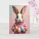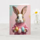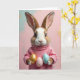 This greeting card features a rabbit-like character with soft brown-and-white fur, long veined ears, and big dark eyes that meet yours with a tender, friendly look 🐰. It wears a rose-pink turtleneck sweater with ribbed texture, and its gentle posture makes it seem as if it’s offering a small gift to someone special. In its paws, three decorated eggs are held close together, like a shared treat between close friends. One egg shines gold, one is pale pink, and one is light blue, each dotted with tiny gold flecks that glint like dust. The background fades from mint green on the left to blush pink on the right, sprinkled with scattered golden specks for a springtime glow 🌷. A short Easter greeting sits near the top in a soft, light-colored font, balanced so it doesn’t crowd the character’s face. The eggs rest just below the sweater cuffs, with the gold-speckled highlights catching the light against the pastel gradient.