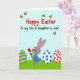 This card shows a soft spring scene under a light blue sky, with a bright green strip of grass running across the bottom. In the foreground, a friendly grey bunny with pink inner ears, rosy cheeks, and wide eyes smiles gently, as if sharing a quiet moment with someone special 🐰. The bunny wears a blue outfit covered in small dots and holds up a single red tulip like a sweet offering 🌷. Nearby sit three large egg shapes, arranged like companions around the bunny: one has yellow and blue wavy stripes, one is white with blue dots, and one is white with red dots. Above them, a few tiny golden-winged insects drift through the sky, adding light motion to the scene. Across the open sky area, an affectionate message is placed in two colors, with the first part in red and the second part in black, set large enough to read at a glance. The overall layout feels balanced, with the character and eggs anchored low and the lettering floating high. The red tulip stands upright in the bunny’s paw, its green stem angled slightly left against the blue background.