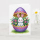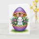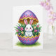 This card features a fluffy white bunny 🐰 peeking out from a cracked purple eggshell, with big gentle eyes and soft pink blush on its cheeks that give it a sweet, friendly look. Around the bunny, leafy greens and spring flowers in pink, purple, and yellow crowd in close, like they’re leaning toward each other in a cozy little garden scene. The egg is decorated with zigzag bands in golden yellow and magenta, plus small glossy blue dots that look like tiny beads catching the light. A short greeting appears near the top in a light color, with smaller text placed lower down in a matching tone so it doesn’t compete with the artwork. Soft lighting smooths the shapes and highlights the bunny’s ears and the curved rim of the shell, adding a tender, affectionate mood. The whole scene sits on bright green grass 🌷, with petals and leaves tucked into the shell’s opening. The purple shell shows golden zigzags and magenta accents, dotted with shiny blue spheres along the curve.