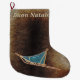 A dog sled with a teal sled bag superimposed on a digital rendering of caribou (reindeer) fur. Text reading "Season's Greetings" also appears. Italian text reading "Buon Natale" appears in glowing blue and white. You may personalize the stocking by adding a bit of text on the sled bag.