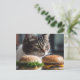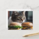 A serene tabby cat sits calmly, with two cheeseburgers placed in front of it, seemingly waiting for the perfect moment to indulge. The cat's gentle gaze is introspective, lost in thought as it contemplates the deliciousness before it. The simplicity of the image belies its charm, as the subtle details of the cat's fur and the tantalizing burgers come together to create a delightful visual treat. Created using AI technology, this design is available on a variety of Zazzle products, from clothing to home decor and more, ready to bring a touch of feline whimsy to your daily life