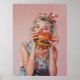 Painting from a cheeky girl in a strawberry dress eating huge burger
