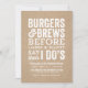 Plain white envelopes are included with paper invitations and will come to fit the invitation size you select. If you don’t need the envelopes, you may choose to not receive them by selecting the dropdown below "Envelopes" and choosing "None." If you’d like to have a design on your envelopes, you can browse all of these available envelopes to find the design that complements your Burgers And Brews Before I Dos Rehearsal Dinner Invitation.