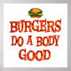 A hamburger lover will enjoy this fun design with a hamburger and the words Burgers Do a Body Good. Makes a great gift.