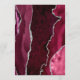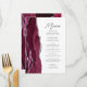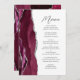 This elegant modern wedding menu features a burgundy red watercolor agate border trimmed with faux silver glitter. The customizable text combines charcoal gray handwriting script and sans serif fonts on a white background. The burgundy and silver agate design is repeated on the reverse side.