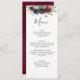 Our modern wedding menu features a burgundy and blue watercolor flowers arrangement.