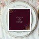 Add a touch of luxury to your reception with these elegant cocktail napkins featuring a sophisticated deep burgundy background. The design is accented with a stunning spray of gold glitter that cascades from the corners, creating a high-quality and celebratory feel for your bar or appetizer service. Your names and wedding date are beautifully displayed in a clean, white serif font, ensuring a polished and cohesive look for your event decor. These personalized napkins offer a chic, modern aesthetic that perfectly complements a formal or romantic wedding theme. These functional accents provide a refined way to celebrate your special day, leaving a lasting impression of your exquisite style.