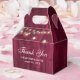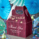 Rustic burgundy wedding thank you favor box featuring string lights on a barn wood background.