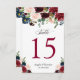 Burgundy Blush Blue Floral Wedding Table Number Card.