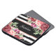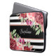 This personalized computer sleeve features a modern watercolor burgundy blush floral design on a black and white striped background with modern script text. Personalize it with a name.