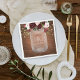 These rustic floral wedding paper napkins feature a bouquet of burgundy and blush flowers on top of a mason jar with the names of the bride and groom and the wedding date inside. String lights decorate the top of the design, with a dark brown rustic wood background.