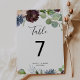 This burgundy floral and greenery wedding table number is perfect for a winter wedding. The elegant boho design features watercolor navy, blush pink and wine shade flowers with artistic penciled details.