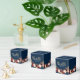 Personalized wedding favor box with Burgundy red floral watercolor design, gold Mr. & Mrs. hand lettered script with married last name and wedding date in white script font typography overlay printed on a solid navy blue color background.