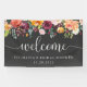 This stunning banner features trendy watercolor flowers in shades of marsala, burgundy, blush pink, and orange, with green leaves on a black, chalkboard look background. Modern burgundy colored typography says "welcome", making this banner perfect for any celebration including bridal showers, baby showers, graduations, and weddings.