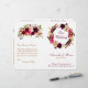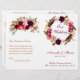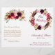 This beautiful burgundy florals wedding program features watercolor flowers, feathers, leaves, branches and other foliage in bold colors of burgundy, wine, purple, orange, pink, red, cream, fuchsia, marsala, green, and gold on a white background. You can change the background color to something other than white if you prefer. The front cover side has a round wreath on it with the words "Our Wedding" in the center. The names of the bride and groom are also on the cover, along with the wedding date and the romantic verse that says: