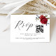 Elegant floral wedding RSVP card featuring watercolor illustration of burgundy and navy peony flowers with greenery. There is also a QR code. Perfect for a fall or winter wedding.