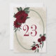 Unique pretty table number card featuring romantic burgundy flowers and green leaves on a beautiful geometric frame .