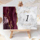 The left-hand edge of this elegant modern wedding table number card features a burgundy watercolor agate border trimmed with faux gold glitter. The customizable text combines black and gold handwriting, italic and copperplate fonts on a gray and white marble background.