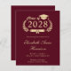 Modern budget-friendly burgundy red college graduation announcement featuring "Class of" in an illustration of a gold laurel wreath, a grad cap topper and a diploma and the graduate's name in an elegant light gold script. Add their school, major, honors or future plans.