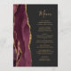 The left-hand edge of this elegant modern wedding menu features a burgundy red watercolor agate border trimmed with faux gold glitter. The customizable text combines gold-colored whimsical handwriting script and copperplate fonts on a slate black background. The reverse side features a matching burgundy and gold agate design.