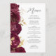 This elegant modern wedding menu features a border of burgundy flowers and gold faux foil leaves. The customizable text combines charcoal gray handwriting script and sans serif fonts. The floral border design is repeated on the reverse side.
