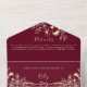 Elegant and romantic, this burgundy and gold floral wedding invitation features delicate vintage-inspired illustrations, a symbolic heart detail, and a built-in RSVP card with QR code. The rich burgundy backdrop paired with metallic-style gold floral accents creates a bold and luxurious feel—perfect for fall weddings, formal celebrations, or rustic-chic themes. A stylish and convenient all-in-one design with timeless charm.