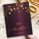 A dark burgundy faux metallic looking background, decorated with faux gold dripping stars. Template for a year, Personalize and add a name and a title. The name is written with a golden modern hand lettered style script with swashes.
