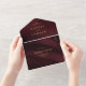 Burgundy Agat & Gold Calligraphy Wedding All in One Invitations are designed with an easy to tear off perforated RSVP postcard. Just simply fold each card into the outlined shape, and then seal and send - no envelope needed for shipping. For further customization, please click the "customize further" link and use our design tool to modify this template. If you need help or matching items, please contact me.