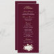 This burgundy menu with gold and white script is simply elegant. A floral bouquet graces the bottom of the menu. The couple's names are on the back with a gold ampersand. Perfect for any occasion ... all fields can be customized for your luncheon or dinner. Optional names on back for weddings and anniversaries