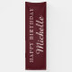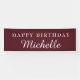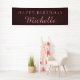 Burgundy and pink "Happy birthday" banner personalized with the name of the guest of honor. Contact us for help with customization or to request matching products.
