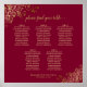 Indulge in the beauty of this wedding seating chart, showcasing a graceful and refined design in gold and maroon or burgundy wine red. The chart features a stylish script calligraphy title, complemented by intricate golden faux foil lace curls and swirls in the corners. With seating assignments for 50 individuals at 5 tables, each table accommodating up to 10 guests, this chart also displays the names of the happy couple and the wedding date at the bottom. Elevate the ambiance of your reception with this sophisticated seating chart, while simultaneously providing convenience to your guests to locate their assigned seats.