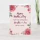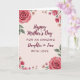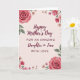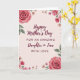 Designed with a soft, romantic floral frame, this card features a pale blush background that gives the whole design a gentle glow ❤️. In the center, the message reads “Happy Mother’s Day” on top, followed by “FOR AN AMAZING Daughter in Law” and then “WITH LOVE” beneath it, arranged in a neat stacked layout. The lettering is a deep burgundy, standing out warmly against the light background without feeling harsh. Around the edges, full multi-petaled roses in several shades of pink mingle with smaller daisy-like flowers, creating the look of a tender bouquet offered with care 🌼. The flowers and leaves have a painted, watercolor-like finish, with soft edges and light texture that suggests a calm, affectionate moment. Green foliage threads between the blooms, adding contrast and guiding the eye back toward the centered text. The border forms a loose rectangle of blossoms, with clusters of roses and scattered small flowers at the corners and along the sides.